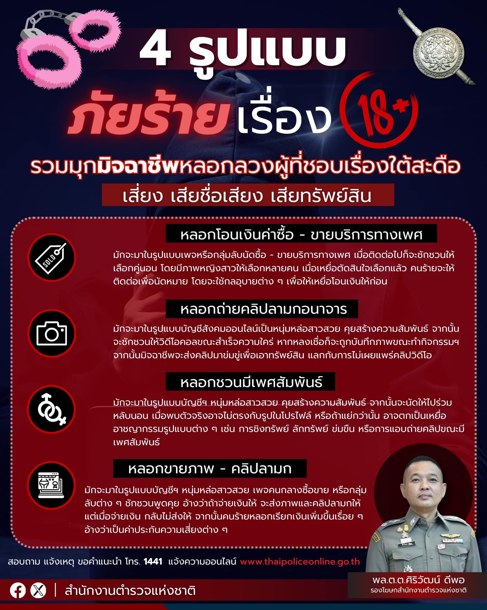 เตือนภัย 4 รูปแบบ #ภัยร้ายใต้สะดือ มิจฉาชีพที่มากับเรื่อง 18+.สำนักงานตำรวจแห่งชาติเตือนสายใต้สะดือ